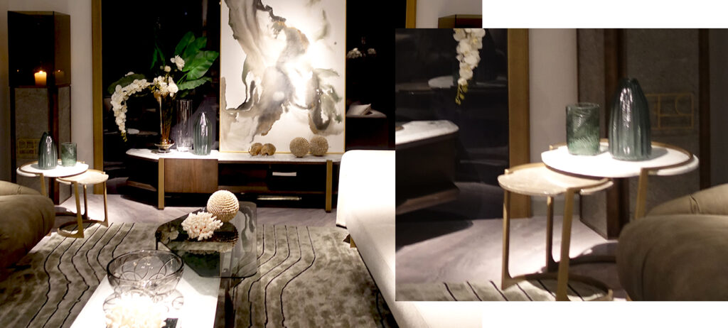 Valuable in design, colour has the power to lighten objects, make rooms more or less warm and cosy, enlarge or shrink spaces by advancing or retreating surfaces. And here we find, between a dove grey wall and an ivory carpet, a wisteria sofa with wide, regular seats, or an earth-coloured floor, illuminated by a beige wall, enlivened by an intersection of volumes of modular round tables, in gradation.