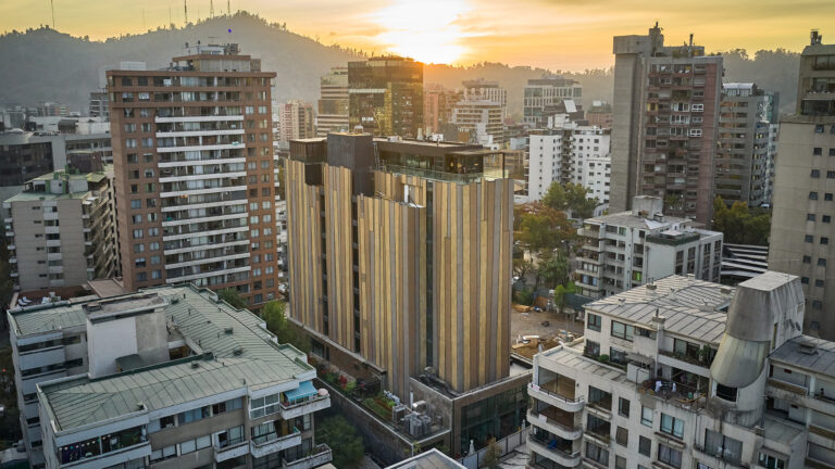 Hotel Nodo: “naturally urban”. A hotel with façades covered in Laminam bioactive surfaces was the first building to actively combat South America’s (*) pollution in Chile’s capital. Its architect, Ricardo Stein, designed the hotel to create a building that could not only iconographically reproduce a forest inside a city (just like a landscape), but could function like a forest and purify the air – like an artificial living organism.