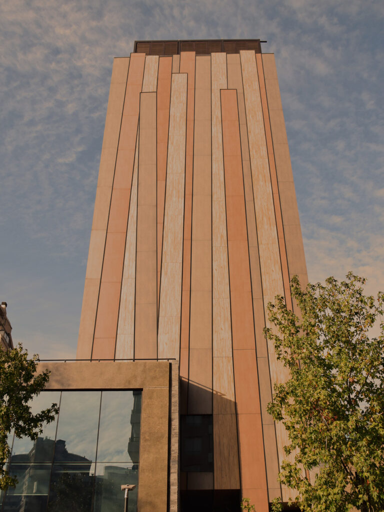 Nature is read aesthetically and iconographically,” explained Stein, “with a stone base on which a wooden vertical body grows with a regular-irregular order, as if it were a forest.” However, following the project’s ideal premise, he used concrete for the base and a pillar, beams, and reinforced concrete slab system for the vertical structure. This allowed “maximum flexibility of use, which is essential in multifunctional buildings”. These façades are covered in Laminam’s bioactive ceramic slabs. Stein explained his choice in this way: “We were looking for surfaces that made us think of wood, particularly forest tree trunks to represent the natural element. We needed something that could help fight pollution by acting as an authentic green space. This meant purifying the air like real trees. We realised that the surfaces produced by Laminam could meet image and function purposes.”