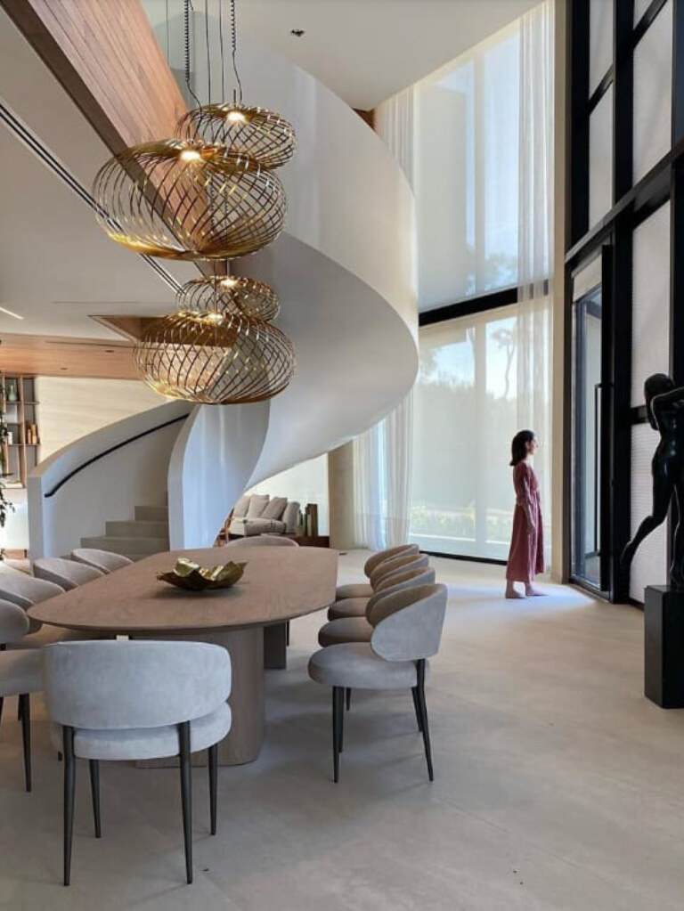 Great care was taken over the design of the communal areas: a large living room with sofas and armchairs and a gourmet area connected to the outdoor patio with pool. The spacious entrance zones encourage interaction between the rooms and thus between their users. The dining-room has a table which seats twelve and is separated by a partition from another, smaller room for family meals. On the ground floor, the communal areas face east to enjoy the best view of the panorama, as does the master bedroom on the second floor, which directly overlooks the beach.