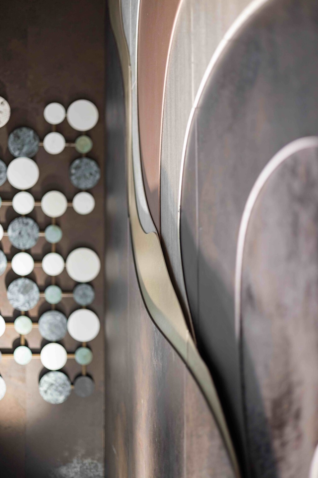 Au cœur de l’exposition, le panneau en bas-relief «Sharyn» reflète les méandres de la rivière Charyn et du canyon éponyme, le deuxième plus grand au monde. Les surfaces céramiques Laminam utilisées incluent Seta Glace, Seta Or, Ossido Verderame, Oxide Moro, Calce Terracotta, Gemini Acero, Noir Desir et Travertino Beige (série Hado). Un autre panneau artistique original a été créé avec une peinture à la main basée sur les pétroglyphes anciens du tract de Tamgaly-Tas.
