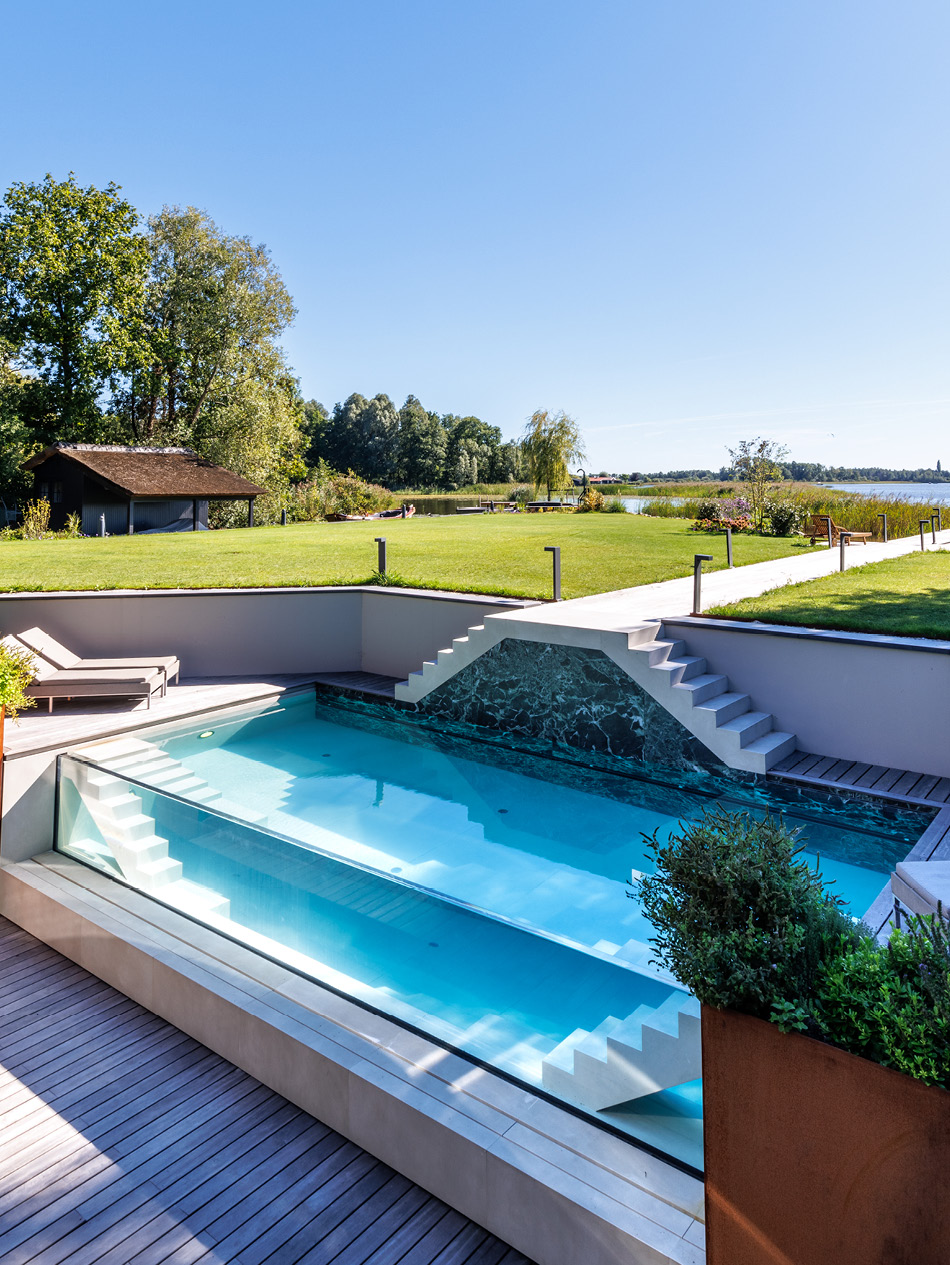 Für die Verkleidung am Beckenrand wurde die Kollektion I Naturali im Farbton Verde Alpi eingesetzt, ein leuchtendes Grün mit weißen Äderungen, das die Farbkontraste zwischen Bergwäldern und verschneiten Gipfeln im Aostatal aufgreift, aus dem der Stein stammt. Am Beckenrand schafft Verde Alpi zusammen mit dem Weiß der Stufen, dem Blau des Beckens und dem Grün der Pflanzen im Garten einen interessanten Rhythmus.