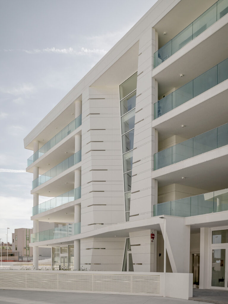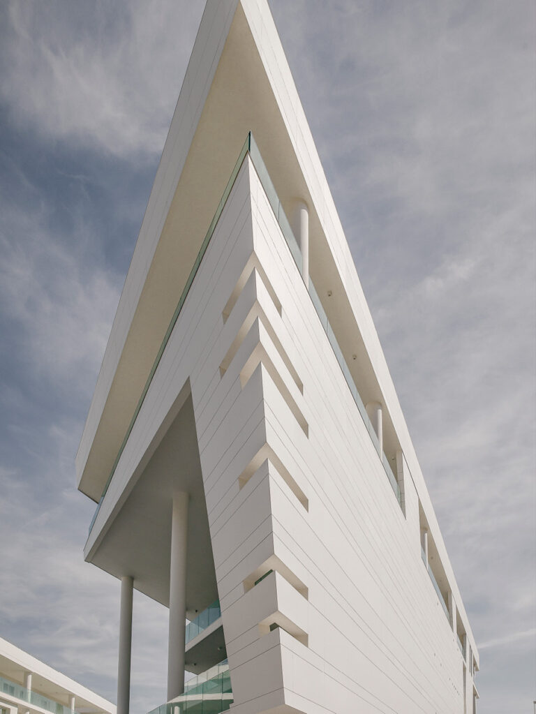 The design of the exteriors is unique, and truly original, distinguished by large windows, terraces onto the central square and perfectly white façades that merge together to create a pointed shape like the bow of a large ship.