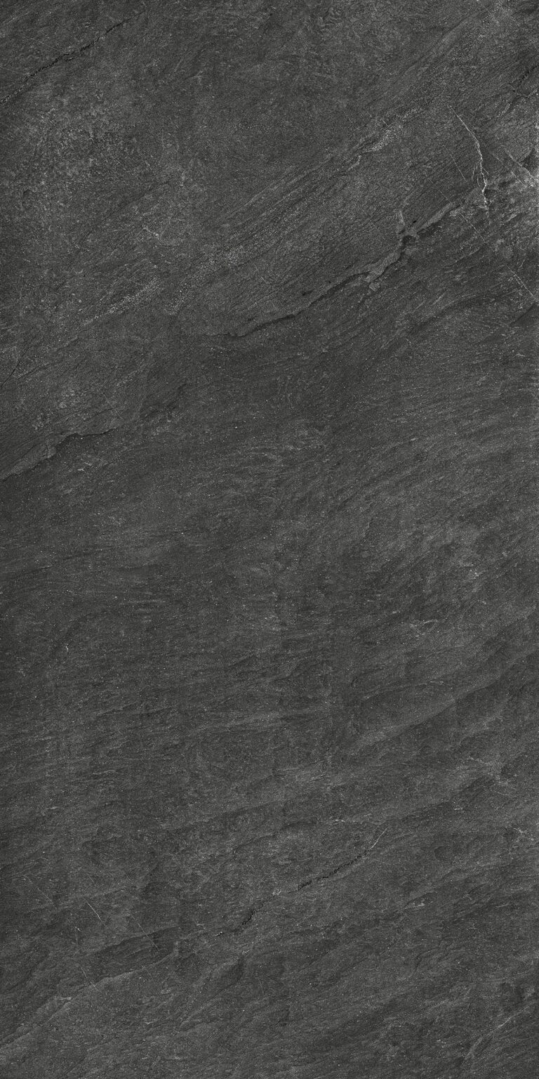 Así, el concepto de frente y reverso queda superado: adecuadamente procesadas, incluso las superficies posteriores de las tablas se ennoblecen y se pueden utilizar a la vista. Disponible en los acabados Natural y Fiammato, ambos en los grandes formatos de 1200×3000 mm y 1620×3240 mm, Pietra di Cardoso Nero viste con reconocida elegancia pavimentos, revestimientos y complementos de decoración, como encimeras de cocina, superficies de trabajo, encimeras de baño, puertas y muebles de baño. R9 y R11 son los acabados antideslizantes que caracterizan los acabados Natural y Fiammato.