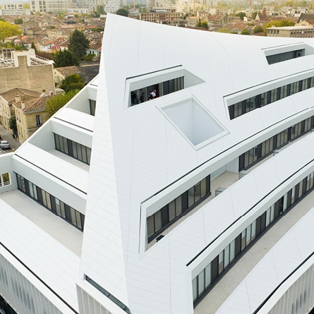 Gaëtan Plessis, Project Manager de Laminam Francia-Oeste, propuso para este proyecto el producto Bianco Assoluto de Collection que respondía perfectamente a los criterios estéticos del edificio, tanto para la fachada como para la cubierta y la bajocubierta. Sinónimo de pureza, el color Bianco Assoluto es un clásico atemporal que, en su acabado Pulido, acentúa la luminosidad de las superficies. Con el color todo masa, resulta ideal para remodelar volúmenes, aportando una sensación de fuerza e impulso vertical a las superficies externas. Al igual que los demás colores de la gama Laminam, Bianco Assoluto es resistente a golpes, arañazos, manchas y agentes atmosféricos. Para el proyecto de la Clinique Thiers, el producto fue sometido a tratamientos bioactivos que permiten que los contaminantes presentes en el aire (COV, NOx, SOx) y el agua sean absorbidos y transformados en elementos no nocivos. «La ventaja de utilizar superficies Laminam para revestimientos en aplicaciones exteriores es su durabilidad con el paso del tiempo», explica Gaëtan Plessis. «Gracias a los tratamientos bioactivos se retrasa la llegada de musgos orgánicos como los líquenes y se purifica el aire. El resultado es una fachada que conserva su buen aspecto año tras año. Las tablas Laminam son un ejemplo perfecto del saber hacer de la empresa y de la excelencia del Made in Italy».