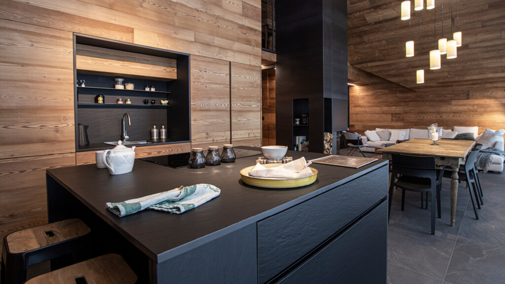 À l’Attico Courmayeur, son dialogue intense avec le bois illustre une coexistence extraordinaire des matériaux, où chacun sublime l’autre. Le contraste apparent des couleurs – le bois chaleureux et accueillant, l’Ardesia Nero Chiselled plus raffiné et majestueux – aboutit à une combinaison harmonieuse et cohérente, laissant une impression durable dans les yeux et l’esprit de ceux qui l’observent.