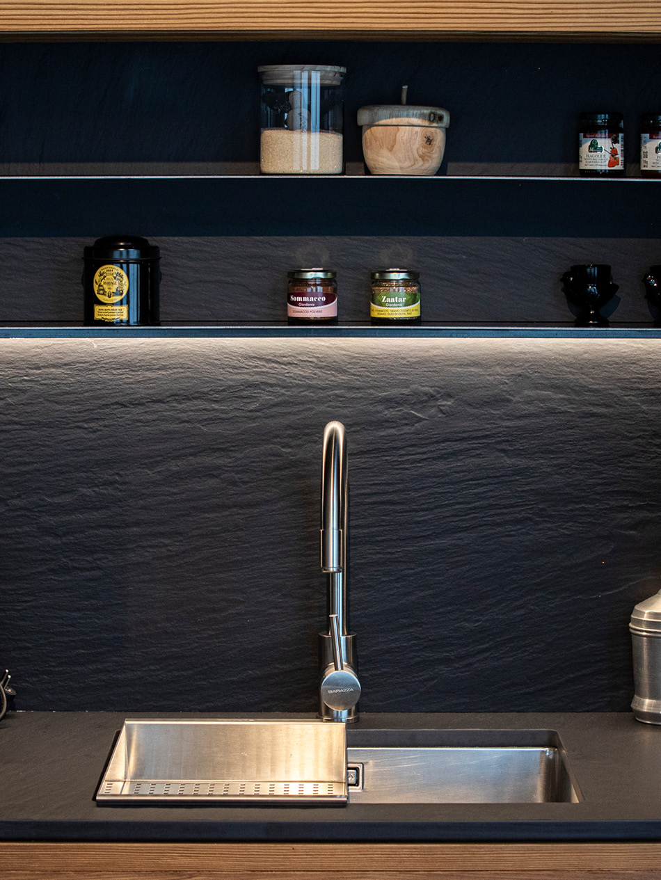 Un élément remarquable dans cet espace suspendu entre passé et présent est Ardesia Nero Chiselled, une surface de la collection I Naturali de Laminam, utilisée sur certains éléments de la cuisine, tels que l’îlot et les portes. Ce choix unique crée une profonde harmonie avec l’espace grâce à son dialogue avec la présence omniprésente du bois, tout en s’imposant comme une présence distinctive et à fort impact.
