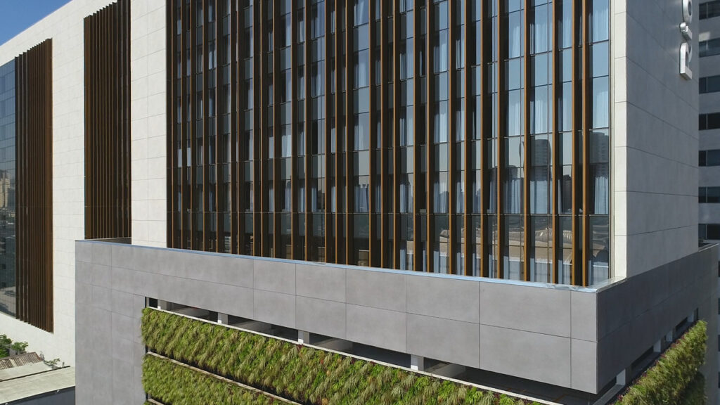 Un premier témoignage de l’engagement de Laminam en faveur de l’environnement est l’Hôtel Nodo au Chili : achevé en 2019, conçu par l’architecte Ricardo Stein, il s’agit en effet du premier édifice d’Amérique du Sud à purifier l’air grâce à des façades réalisées avec des finitions Laminam traitées avec Ambience.