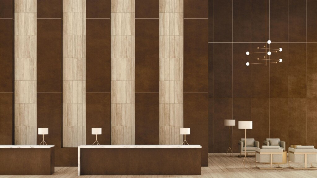 - Dans ce lobby habillé en Ossido Bruno, le regard se pose sur l’équilibre parfait entre sobriété et sophistication. Le sol et les murs dialoguent dans une même tonalité douce et naturelle, pendant que les comptoirs se dressent comme des volumes élégants et rassurants. La matière raconte ici une vision du luxe — responsable, chaleureux, durable.