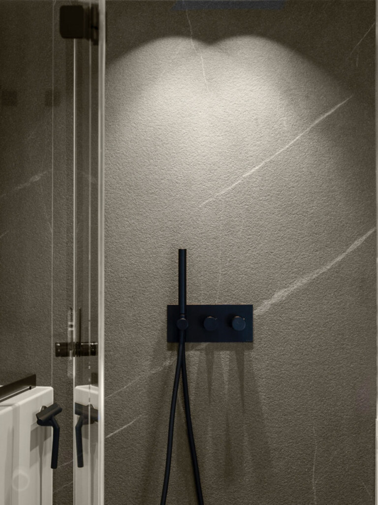 Versatilità e performance delle superfici Laminam hanno trovato la loro massima espressione in un contesto così sfidante come quello navale, dove resistenza e bellezza devono coesistere in perfetta armonia. La collezione In-Side, in particolare la nuance Pietra Piasentina Grigio, è la protagonista ceramica di questo progetto ricercato. Per il rivestimento verticale della parete doccia, è stata selezionata la finitura Fiammato, che con la sua texture materica aggiunge profondità e carattere, richiamando la forza della pietra naturale. Nell’isola cucina e per il top bagno, la scelta è ricaduta sulla finitura Naturale della stessa collezione, che offre un’eleganza sobria e una superficie incredibilmente performante.