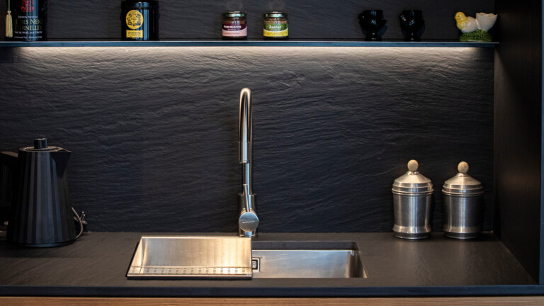 Ardesia Nero a Spacco è disponibile in 3 differenti spessori (Laminam5/Laminam12+/Laminam20+) e può essere applicata sia nell’edilizia tradizionale come rivestimento a facciata, sia in interno come rivestimento, pavimentazione o nei complementi di arredo di design. In cucina, Ardesia Nero a Spacco contribuisce alla sicurezza e all’igienicità dell’ambiente grazie alle prerogative tecniche che sono proprie di tutte le superfici Laminam: resistenza alle macchie, alla flessione, ai prodotti chimici, agli shock termici, a funghi e muffe e idoneità al contatto con gli alimenti. Resistenti anche all’umidità, le grandi lastre Laminam sono la scelta ideale in spazi soggetti all’acqua o al vapore, o che richiedono una pulizia costante.