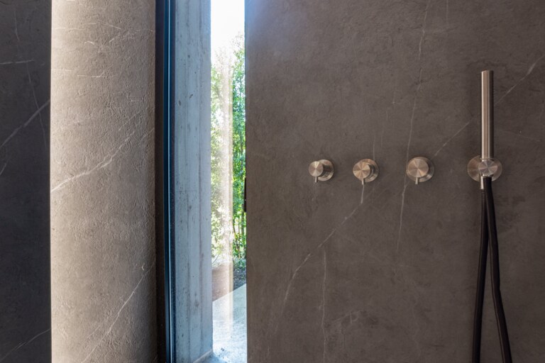 Infine, la collezione I Naturali, con Pietra Grey Bocciardato, definisce gli spazi dedicati al benessere: rivestimento verticale e pavimento doccia, con lavabo integrato e top, creando un ambiente di purezza visiva e sensoriale. La ceramica Made in Italy Laminam è un elemento architettonico chiave per creare continuità materica e armonia cromatica, conferendo personalità ai rivestimenti orizzontali e verticali.