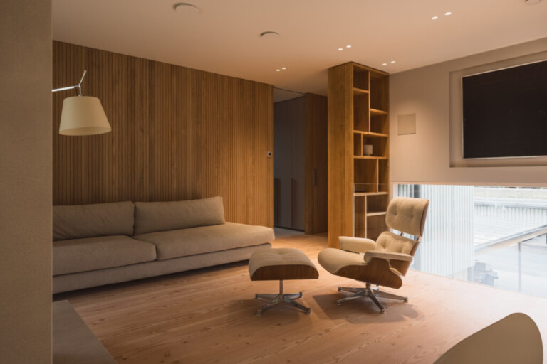 Wszechstronność ceramiki Laminam sprawiła, że ten sam materiał można było zastosować w różnych pomieszczeniach, a nawet na meblach, na przykład jako blaty robocze czy okładziny ścienne, tworząc w ten sposób spójną i harmonijną linię estetyczną. „Seria Calce została wybrana ze względu na poczucie spokoju, jakie potrafi wprowadzić do wnętrza, a poza tym pozwoliła nam na wiele różnych zastosowań” — wyjaśnia architekt.