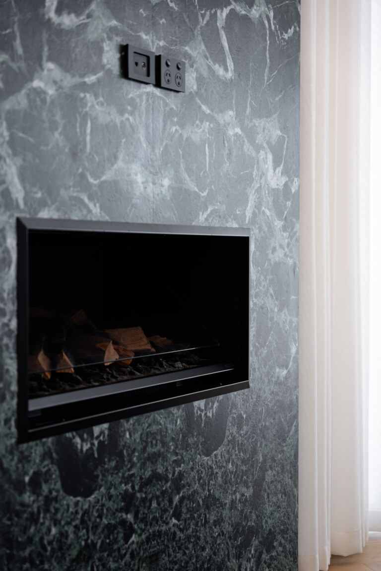Kominek wykończony płytami Verde Alpi Bocciardato (wyk. groszkowane) bijącym sercem salonu
