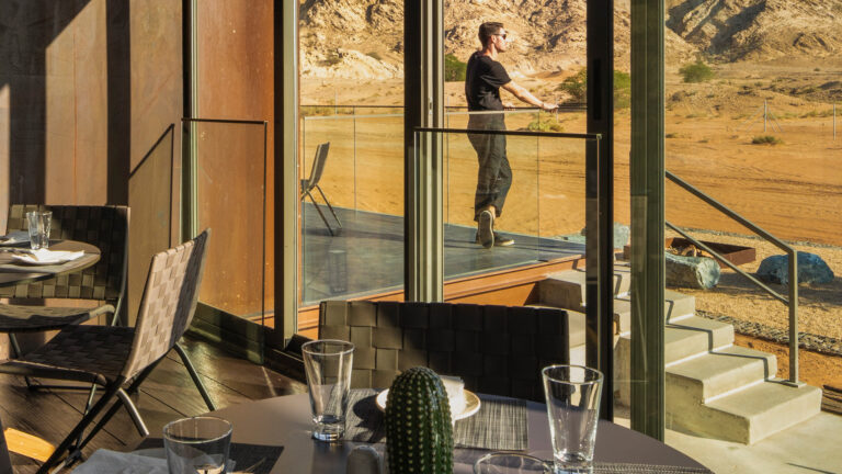Partendo da tutte queste considerazioni, Jonathan Ashmore ha rivestito parzialmente le pareti esterne del boutique hotel con l’acciaio ossidato di CorTen e di utilizzare come materiali strutturali secondari l’alluminio e robusti legni duri come il teak, in particolare per tetti sporgenti, elementi ombreggianti e i terrazzi innalzati oltre il livello delle sabbie. Una serie di soluzioni che, insieme a parti dei muri intonacate, hanno aggiunto eleganza e precisione al progetto e donato agli edifici un cambio soffuso di tonalità e di texture, concepite per maturare nel colore nel tempo in risposta all’impatto del clima.