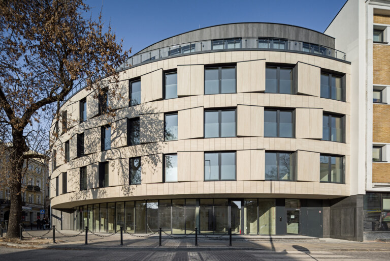 Aurum Residence – budynek mieszkalno-usługowy projektu Pawła Wojtkiewicza z W2 Studio – powstał na lubelskim Starym Mieście, przy biegnącej po łuku ulicy Peowiaków. Kształt działki sprawił, że jest tu tylko jedna, ale bardzo dobrze wyeksponowana elewacja. Świetnie widać ją z wielu stron. Dlatego otrzymała tak wysokiej klasy formę.