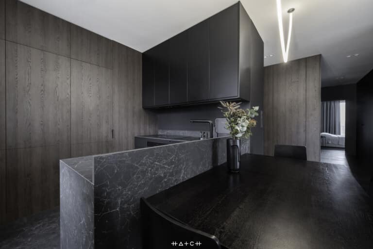 W apartamencie na Woli architektki z Hatch Studio zastosowały spieki Laminam w dwóch grubościach: 12,5 mm na blacie kuchennym i 5,5 mm na posadzce w kuchni i w przedpokoju (spieki doskonale nadają się na podłogę, ściany a nawet elewacje). – Bardzo zależy nam żeby projektowane przez nas wnętrza były spójne, a połączenia materiałowe nie były przypadkowe – mówi Daria Wiergowska. – Spieki kwarcowe Laminam pozwalają nam na stosowanie tego samego wzoru na różnych powierzchniach. Osobiście wzór Nero Greco jest jednym z moich ulubionych więc byłam bardzo zadowolona, że spodobał się także moim klientom – wyjaśnia architektka.