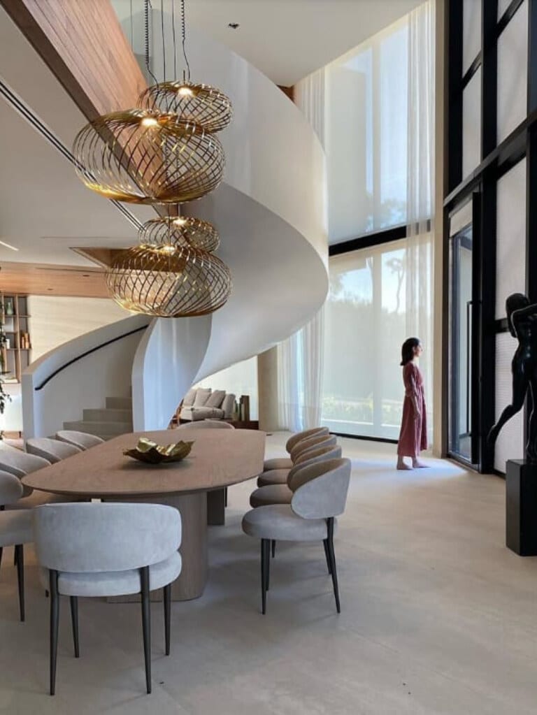 Dużą uwagę poświęcono organizacji części wspólnych: dużego salonu z sofami i fotelami oraz strefy barowej połączonej z zewnętrznym patio z basenem. Przestronne wejścia sprzyjają interakcji pomiędzy poszczególnymi pomieszczeniami, a tym samym pomiędzy przebywającymi w nich osobami. W jadalni znajduje się dwunastoosobowy stół, a specjalna ścianka działowa oddziela ją od kolejnego pomieszczenia, nieco mniejszego, przeznaczonego na obiady w gronie najbliższych. Części wspólne na parterze usytuowano od strony wschodniej, aby zapewnić jak najlepszy widok na pobliską panoramę; dotyczy to również sypialni z łóżkiem matrymonialnym na drugim piętrze, z której rozpościera się bezpośredni widok na plażę.