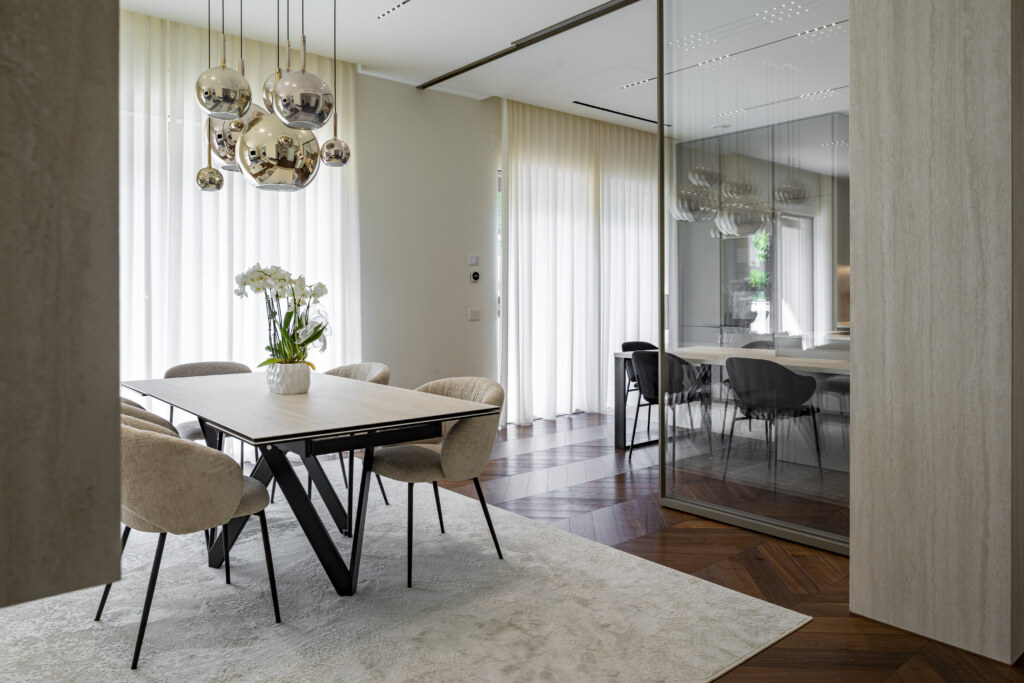 Powierzchnię tę zastosowano także na stole jadalnianym (który stał się dzięki temu elementem wystroju wnętrz o znaczącym efekcie wizualnym), na blacie kuchennym, na ściance przeciwbryzgowej i na obszernym półwyspie stanowiącym blat roboczy, w przypadku którego jest ona gwarancją odporności, funkcjonalności i łatwości czyszczenia. Trafiła też na podłogę wewnętrzną obszaru przeznaczonego na przygotowywanie posiłków. Hado marki Laminam wybrano również jako okładziny ściany pionowej współdzielonej z salonem, dzięki czemu nadano pomieszczeniom ciągłość: w tej nowoczesnej rodzinnej przestrzeni płyty Travertino Bianco Bocciardato (groszkowane) stanowią element dekoracyjny, w postaci okładziny pionowej meblościanki i ściany z wykonaną w murze półką, dzięki którym stworzono idealną grę brył i geometrii, w której współgrają ze sobą drewno, naturalna ceramika, ciepłe oświetlenie i szlachetne tkaniny.