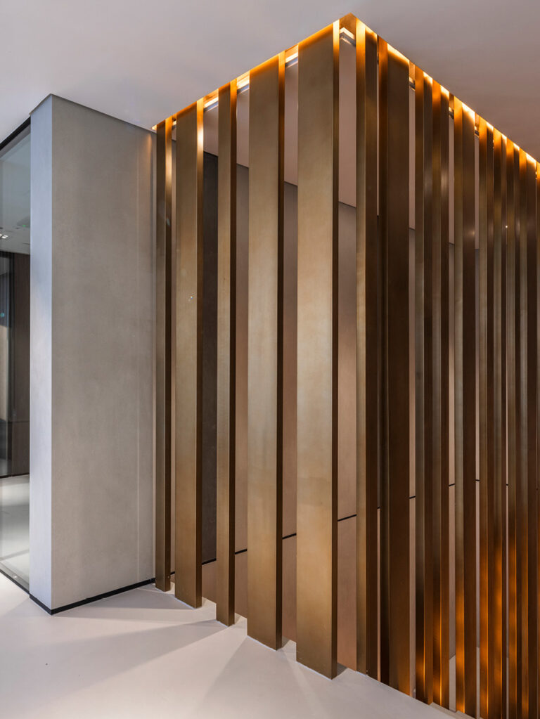 Il team di Pininfarina Architecture mirava a creare un edificio dove lo spazio interno desse una sensazione di continuità con l’esterno. Così, il tema principale della Lobby è diventato il ritmo creato dalle due tinte, Grigio e Antracite, delle lastre ceramiche Laminam della collezione Calce.