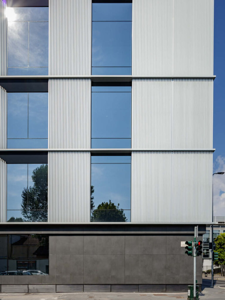 Da un punto di vista formale, la facciata si contraddistingue per l’estrema regolarità ed eleganza del disegno. L’impressione di complessivo dinamismo è dovuta alle superfici opache ridotte al minimo e ai fronti rivestiti di pelle vetrata. La pulizia delle forme è movimentata dalla scansione verticale offerta da elementi prismatici su misura in estruso di alluminio, che introducono interessanti effetti di tridimensionalità.