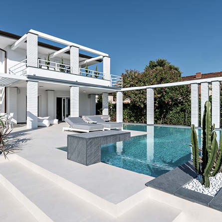 Laminam, la pelle per l’architettura e il design, sinonimo di superficie, durevole e riconoscibile. La lastra Laminam non è solo un elemento della progettazione; può diventare il materiale unico con cui decorare e rivestire funzionalmente ogni ambiente. Con questo approccio Michele Vitaloni Interior Designer dello Studio di progettazione Charmitaliastudio, ha pensato e disegnato il restyling d’interni ed esterni di Villa Due a Forte dei Marmi. Le linee pulite, il design nitido e funzionale rivela uno stile di progettazione razionale che non rinuncia all’estetica, un marchio distintivo dello Studio che trova espressione nella scelta dei materiali di rivestimento.