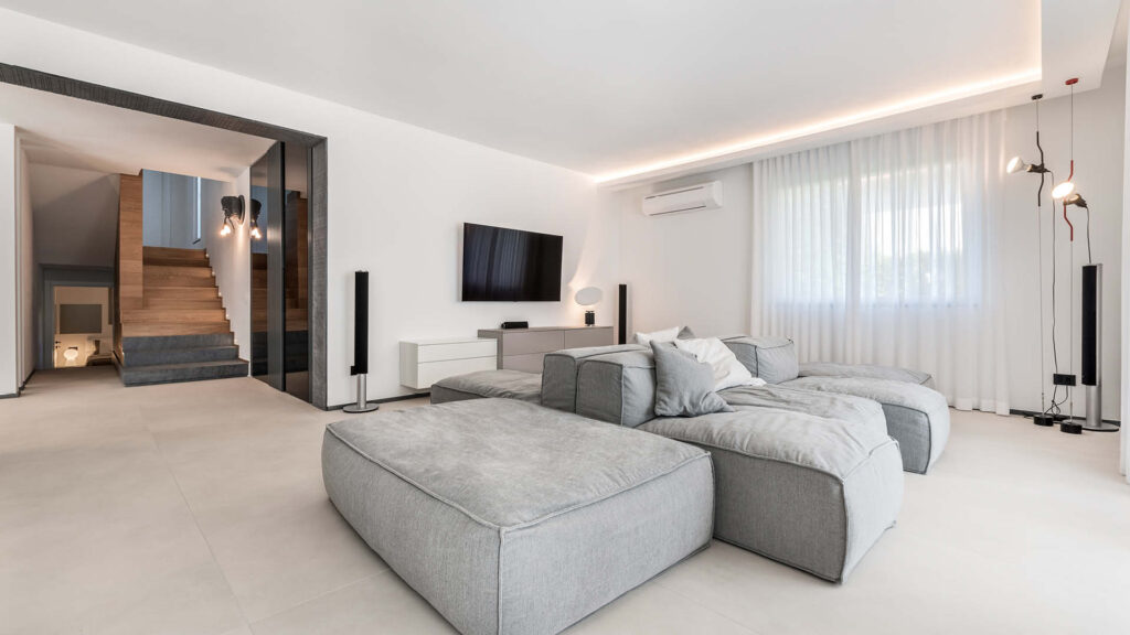 In esterno, le lastre Laminam Calce Bianco sono utilizzate per il pavimento dell’area cortiliva e del portico per creare un effetto di uniformità rispetto allo stile degli interni. La texture Calce, ispirata a intonaci e cementi industriali, dona agli ambienti un aspetto contemporaneo e ricercato, una sensazione di benessere che concilia la pace e la vivibilità degli spazi.
