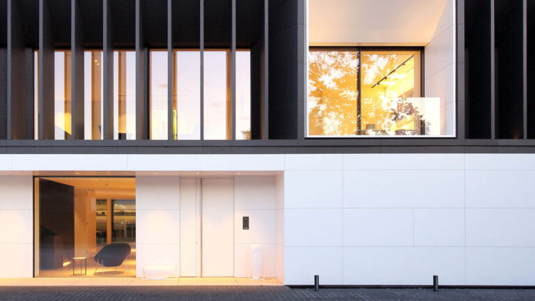 Come spiega lo stesso architetto, “una composizione di sottili cornici nere e bianche articola i pieni e i vuoti dei due livelli esterni, mentre una serie di patii bianchi scavati porta aria e luce naturale al livello interrato. Le cornici, ciascuna corrispondente ad uno specifico spazio interno, sono rivestite con lastre ceramiche nere di Laminam e pannelli in alluminio bianco montati su un sistema di facciata ventilata”.