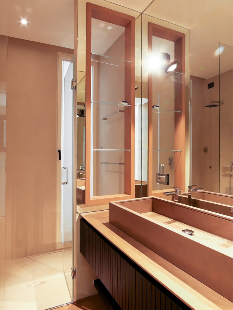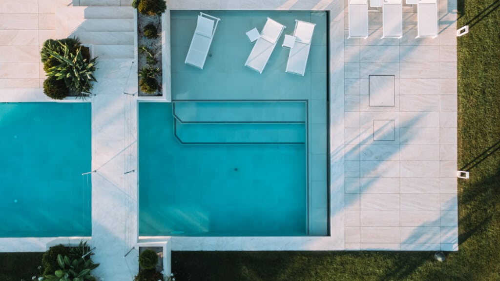 W przypadku okładzin basenu i przylegających do niego stref architekt Tanzini postawił na jakość estetyczną i doskonałe parametry płyt wielkoformatowych marki Laminam. Kolekcja Calce w wariancie Avorio okazała się rozwiązaniem, które najbardziej zbliżone jest do koloru i cech materiałowych trawertynu — kamienia naturalnego, który spośród materiał miał przeważać w całym projekcie. Poprzez wariant Avorio kolekcja Calce przewyższa czystość śnieżnobiałej bieli, łącząc w sobie świeżość dobrze znanych propozycji z poczuciem przyjemnego ciepła w zestawieniu o niezwykłej dozie wyrafinowania. Przy doborze jej jako okładziny basenu wzięto pod uwagę między innymi ostateczny odbiór, jaki materiał ten zapewnia przy basenie pełnym wody, który jest wizualnie ciemniejszy niż basen pusty. Na taką grę wariacji wpływa również światło: to naturalne tworzy na wodzie ruchy chromatyczne, które nieustannie zmieniają się w zależności od pory dnia, od warunków pogodowych i od pory roku; z kolei światło sztuczne, bardziej statyczne, moduluje swoje efekty w zależności od swojej temperatury: jest zimne, jeśli jest białe, i cieplejsze, jeśli jest żółte.