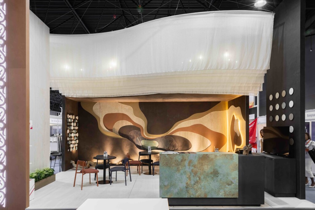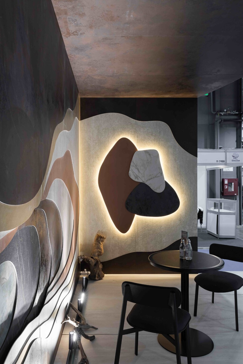 Настенное панно-светильник собрано из 3-х объемов разной формы (Gemini Pelle, Calce Terracotta, Oxide Moro), напоминающие по своим очертаниям скальные породы в устьях реки и скалу Жумбактас в Боровом. Образы знаменитых гор Мангистау и закатного солнца также присутствуют в экспозиции стенда. Инсталляция, выполненная из I Naturali Pietra Di Savoia Avorio, посвящена архитектурным объемам хребтов и гор-останцев живописного урочища Бозжыра, расположенного на западном краю плато Устюрт.