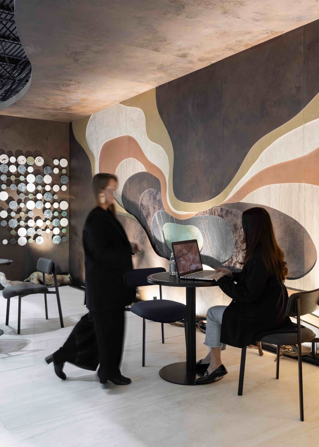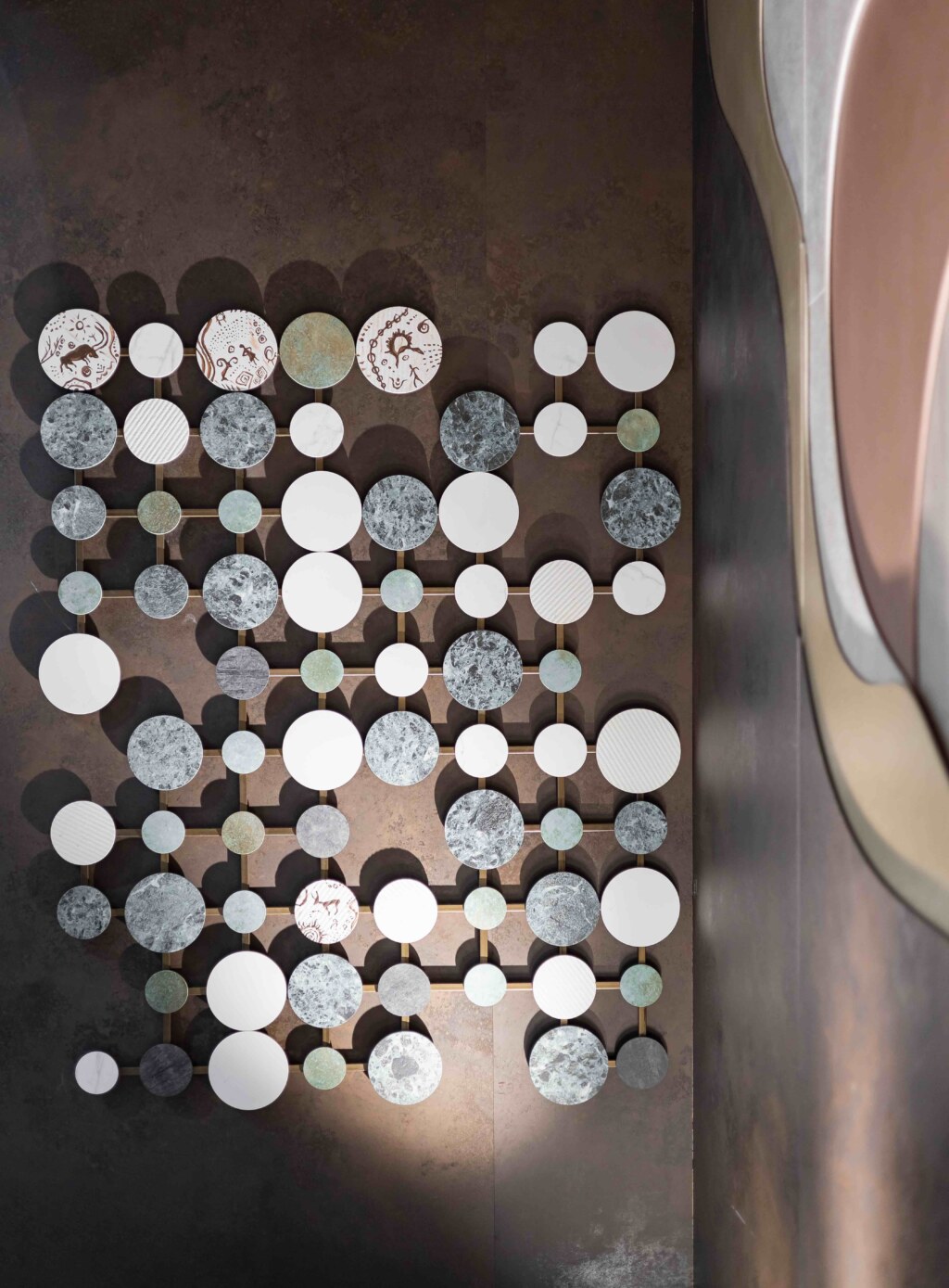 Специально для экспозиции было создано еще одно авторское художественное панно с ручной росписью дизайнеров студии MONDIAL по мотивам древних наскальных петроглифов в историческом месте Казахстана – в урочище Тамгалы-Тас. Керамические поверхности Laminam на панно: I Naturali Verde Alpi, Ardesia Bianco a Spacco, I Naturali