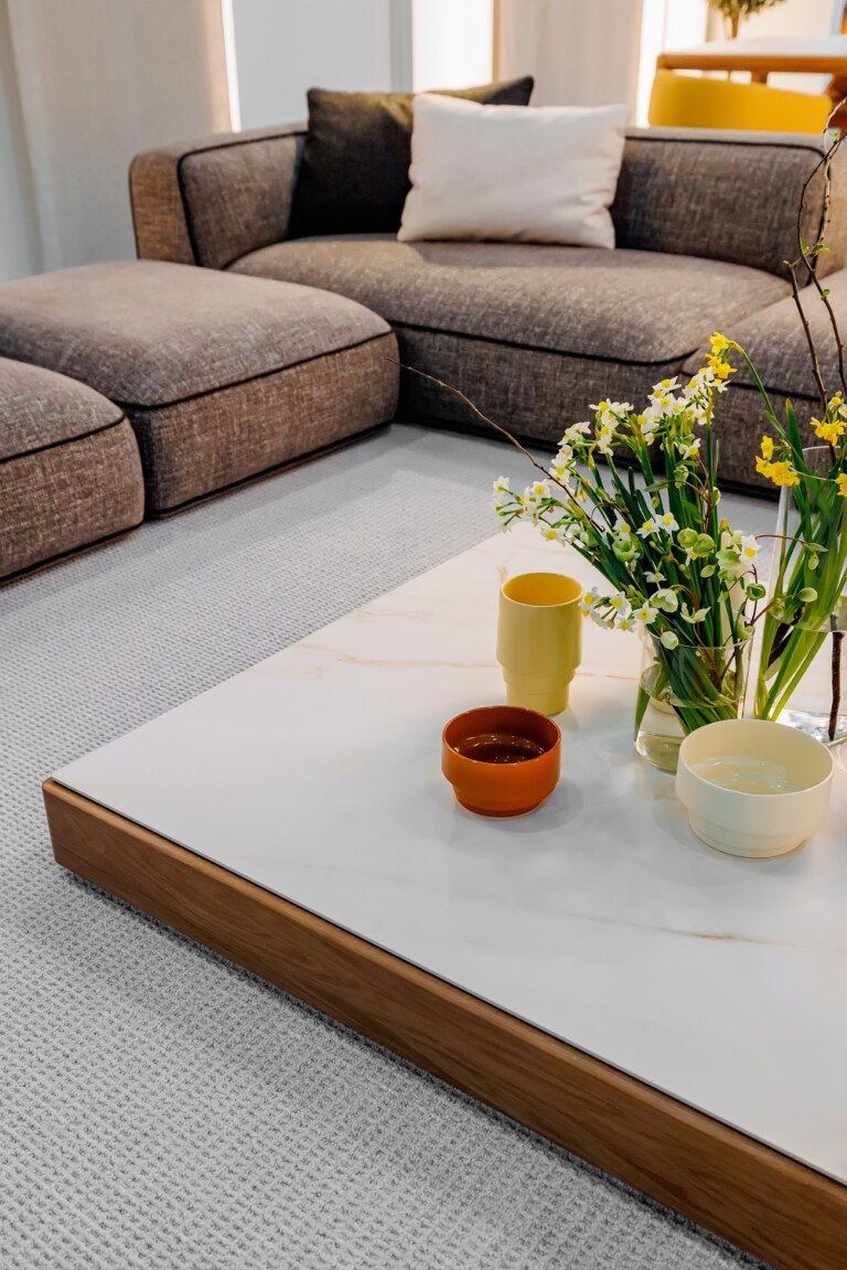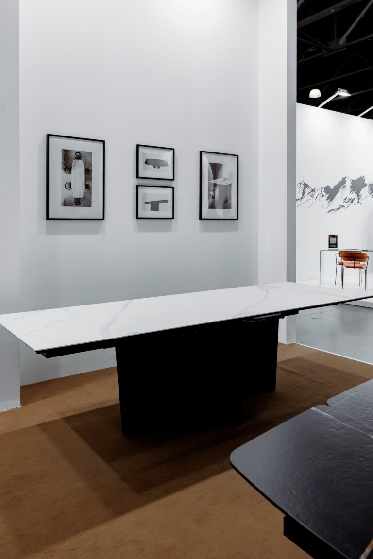 Умные столы от фабрики Robo Listving были представлены элегантными яркими текстурами Sahara Noir Extra, Ossido Verderame, Bianco Statuario Venato. Столы оснащены автоматическим механизмом раздвижения, который меняет размер столешницы одним нажатием на кнопку.