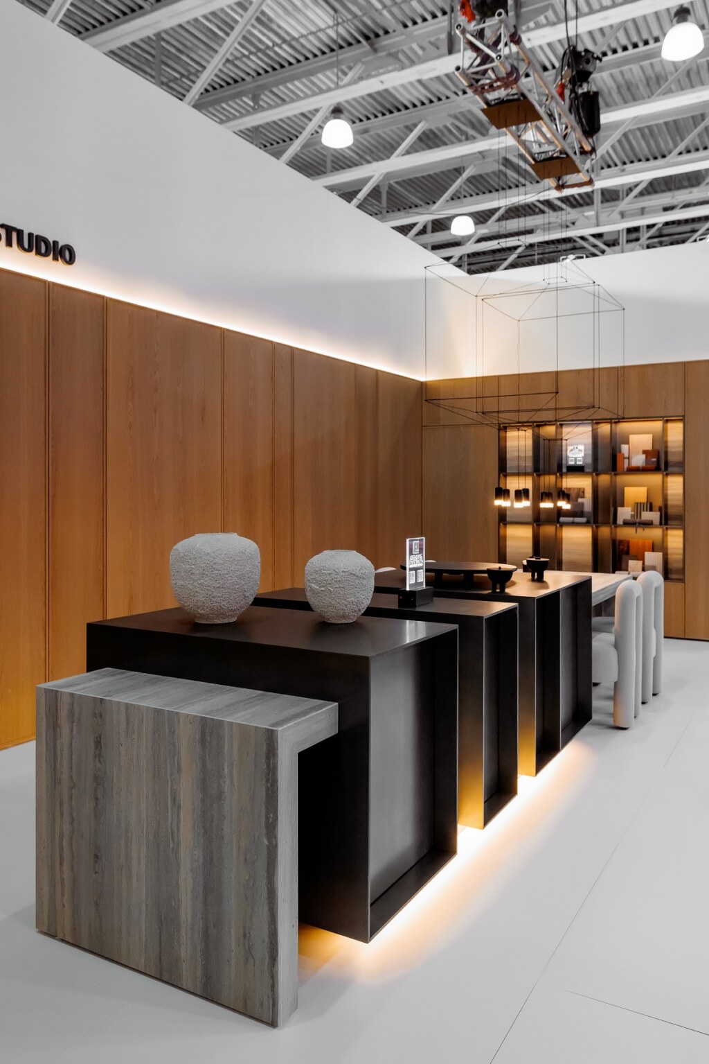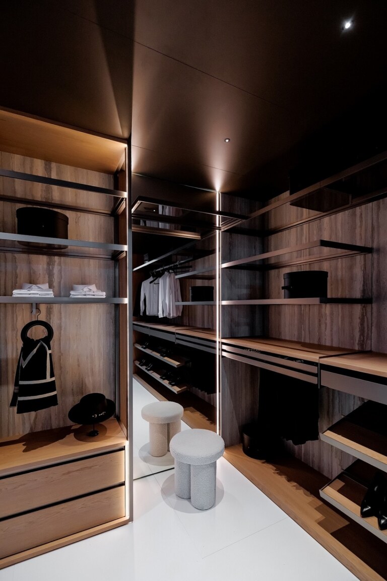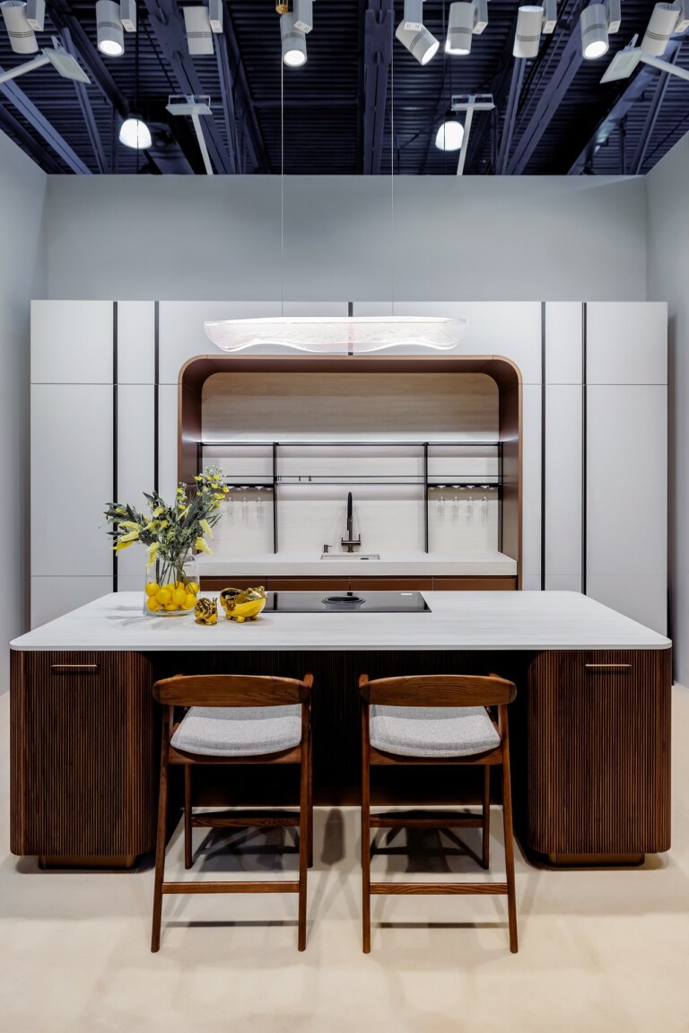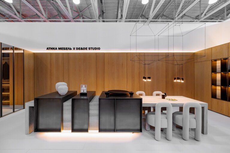 На стенде авторской мебели АТИКА, созданный в партнерстве со студией интерьерного дизайна и архитектурного проектирования DESIGN&DÉCOR, был представлен остров и гардеробная c применением керамических поверхностей из коллекции I Naturali, Travertino Grigio Venato Bocciardato в толщинах 5+ и 12+. В основу концепции стенда лег принцип устойчивости. Современные реалии активной и переменчивой жизни мегаполиса создали потребность в пространстве, где можно замедлиться и порефлексировать. Линейный узор поверхности Travertino Grigio Venato воспроизводит классический рисунок травертина. Идеальный тандем равномерных бежево-серых слоев и выбеленных вкраплений отсылает нас к эстетическому совершенству камня – сдержанный без ярких декоративных элементов и одновременно многослойный по своей текстуре. Тип поверхности Bocciardato подчеркивает фактурный объем поверхности. Итальянский травертин характеризуется фоном нежных оттенков серого с характерными светлыми прожилками, которые направляют взгляд по горизонтальной или вертикальной поверхности. Натуральные и тактильные материалы Laminam, комфортные решения и качественное исполнение — все это посетители могли найти на стенде АТИКА.