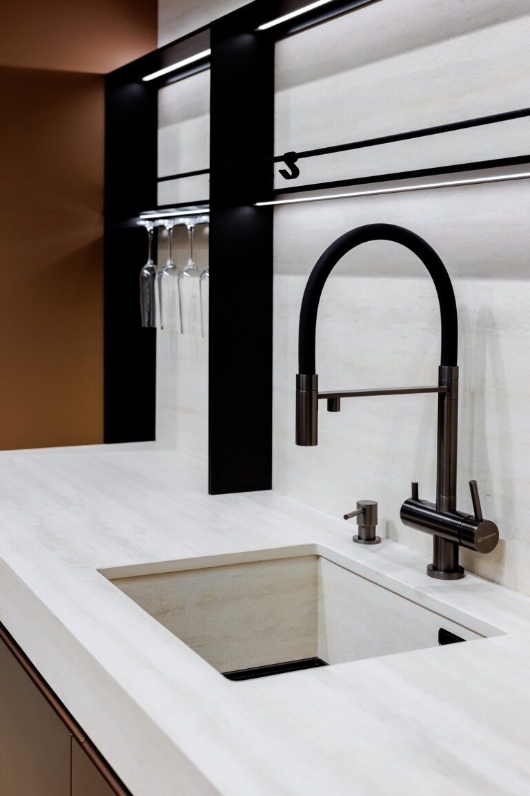Кухонная фабрика Greta выбрала для облицовки кухонных столешниц и острова тактильную текстуру Travertino Bianco Bocciardato из коллекции HADO в толщинах 12+ и 20+. Коллекция передает японскую поэзию терпеливого труда, с которым вода, омывая камень, высекает его завораживающий по красоте профиль и тем самым преображает ценный образец декоративного травертина. Произведение природы, которое, подобно волне, проходящей сквозь века, перетекает в новые жилые пространства.