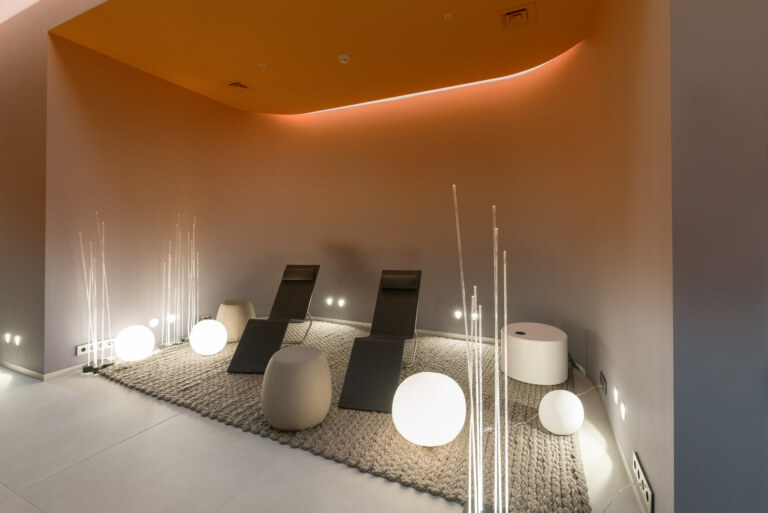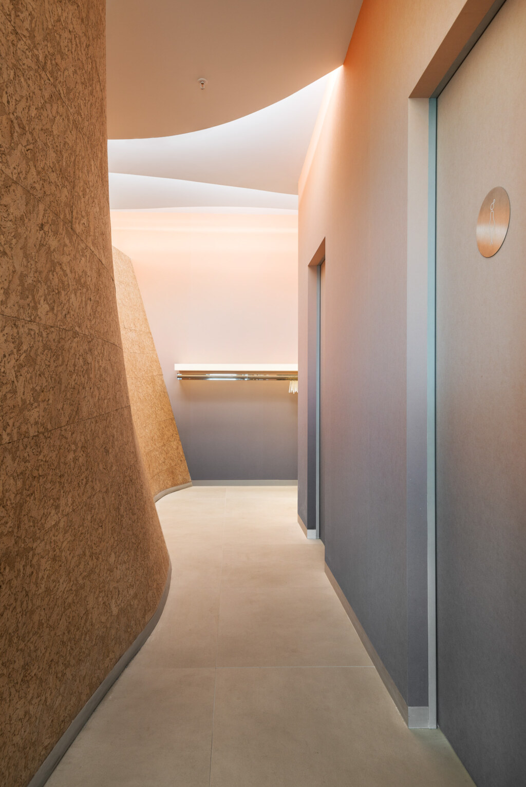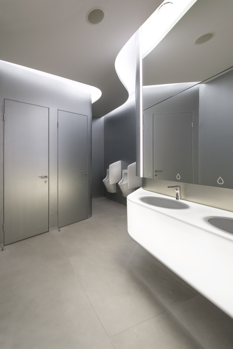 Бизнес-зал представляет собой вытянутое помещение с панорамным остеклением, откуда открывается замечательный вид на пейзажи солнечного края. Именно эта панорама стала главной доминантой при организации пространства. Архитекторы студии по максимуму сохранили возможность наслаждаться пейзажем каждому пассажиру и спроектировали интерьер таким образом, чтобы разделение зон, не перекрывало панораму. Все сервисные и сантехнические помещения расположены по внутреннему периметру помещения, посадочные места отделены друг от друга эфемерными перегородками из нитей на металлическом основании, мебель подобрана так, что образует замкнутые обособленные зоны. Для усиления эффекта органического дизайна и визуальной целостности пространства, в отделке зала были использованы тонкие керамические плиты – помимо эстетической составляющей, керамика полностью отвечает самым высоким эксплуатационным требованиям: долговечна, огнестойка и поддерживает прекрасный акустический комфорт. Архитекторы Vox выбрали серию Calce в Grigio толщиной всего 5,6 мм для полов, а текстуры Filo в Argento толщиной всего 3,5 мм для стен и дверей уборных.