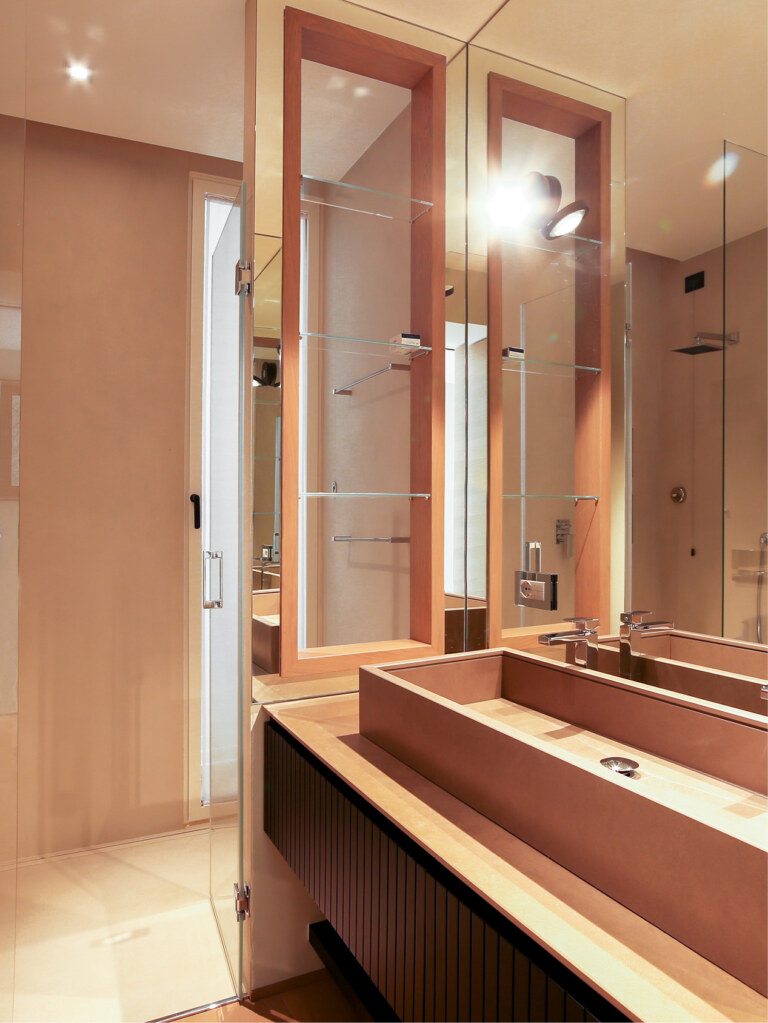 Поверхности Calce Avorio с их снежной белизной были использованы для отделки всех семи ванных комнат дома, где их прекрасно оттеняют столешницы из плит Rena Fokos.