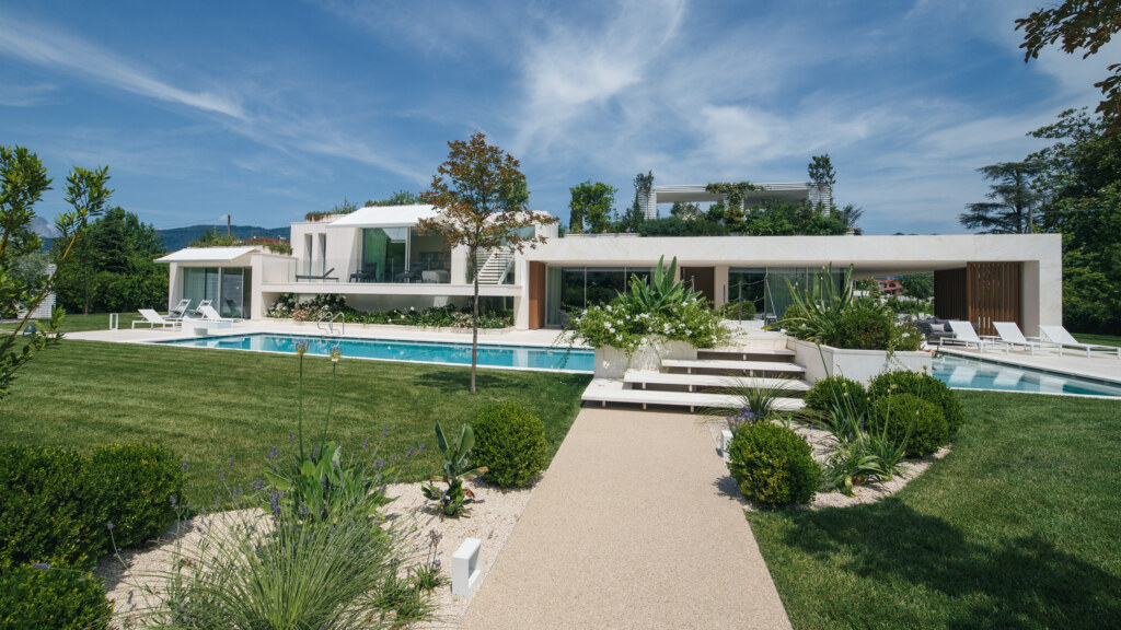 Роскошная резиденция в не менее чудесных декорациях: вилла Glass House в Форте-деи-Марми с ее четкой прямоугольной формой, яркими цветами и панорамными окнами выглядит как квинтэссенция минимализма.