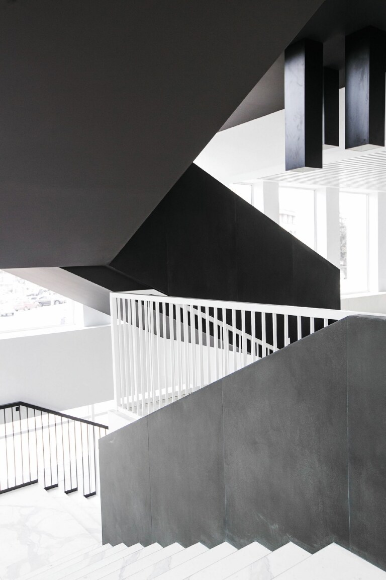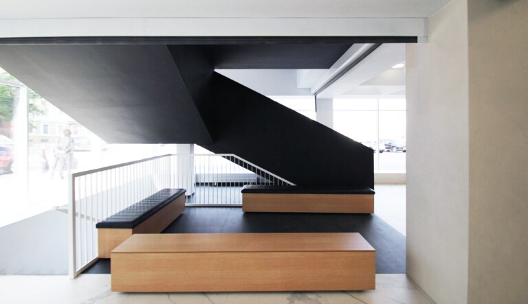 Отделка интерьеров зала — это вариация на тему советской эстетики. В помещениях прослеживается игра черного и белого — светлые керамические плиты Bianco Statuario Venato «под мрамор» в качестве напольного покрытия, черные перила и угловатые черные модули в зоне буфета — Calce Nero, и снова светло-кремовый оттенок квадратных колонн, отделанных Calce Bianco.