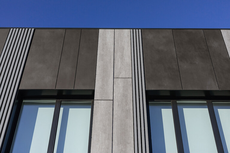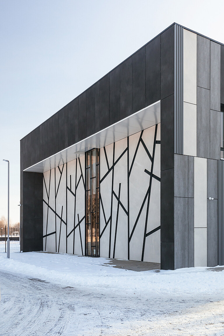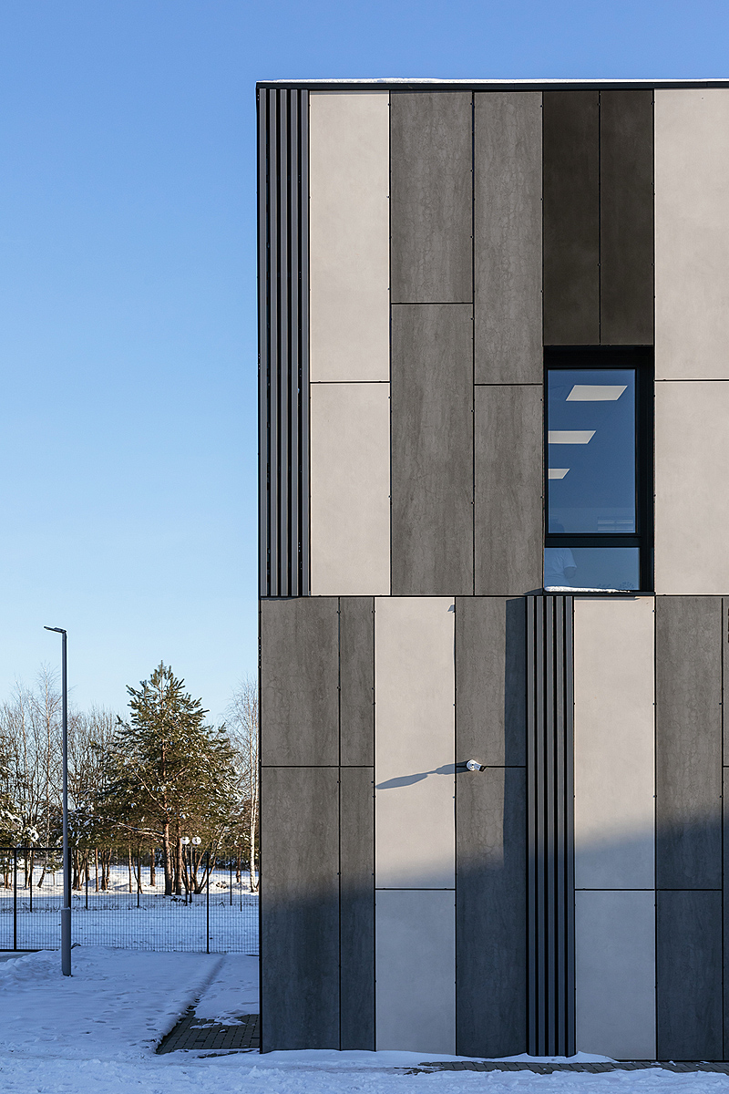 При проектировании фасадов команда учитывала их стилистическую гармонию с яркими интерьерными решениями, а также следовала общему дизайн-коду Доброграда. Для воплощения минимализма, лаконичности и одновременно фундаментальности, в основе которой образ «гранита науки», были использованы поверхности Pietra Di Savoia Grigia Bocciardato серии I Naturali, Nero и Bianco серии Calce.