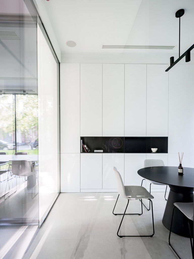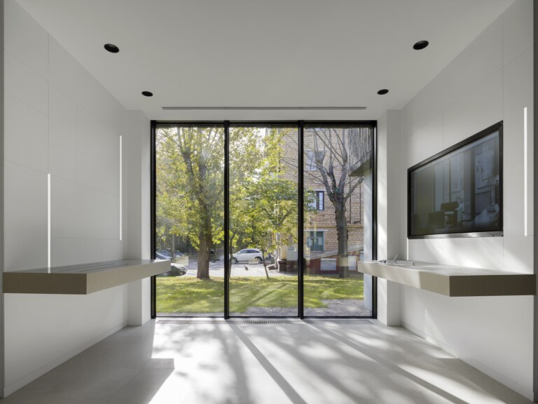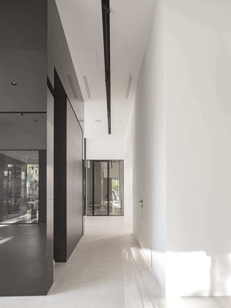 Лаконичный и функциональный интерьер шоурума выполнен в строгой цветовой гамме, основные цвета: черный, серый, белый и золотой, который задает настроение сдержанной современной роскоши. В офисе продаж представлено девять переговорных комнат, демонстрационная и игровая зоны, кофе-поинт и бар, бэкофис, кабинет руководителя и необходимые технические помещения.
