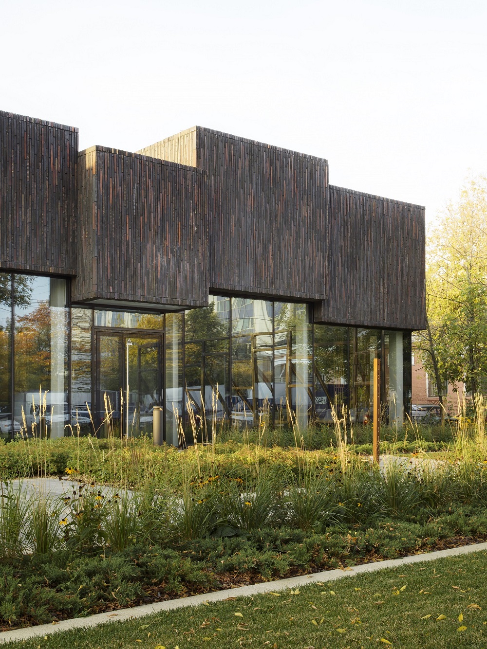 В благоустройстве принят тот же принцип что и на фасаде — ландшафт состоит из прямоугольных блоков на разных уровнях.