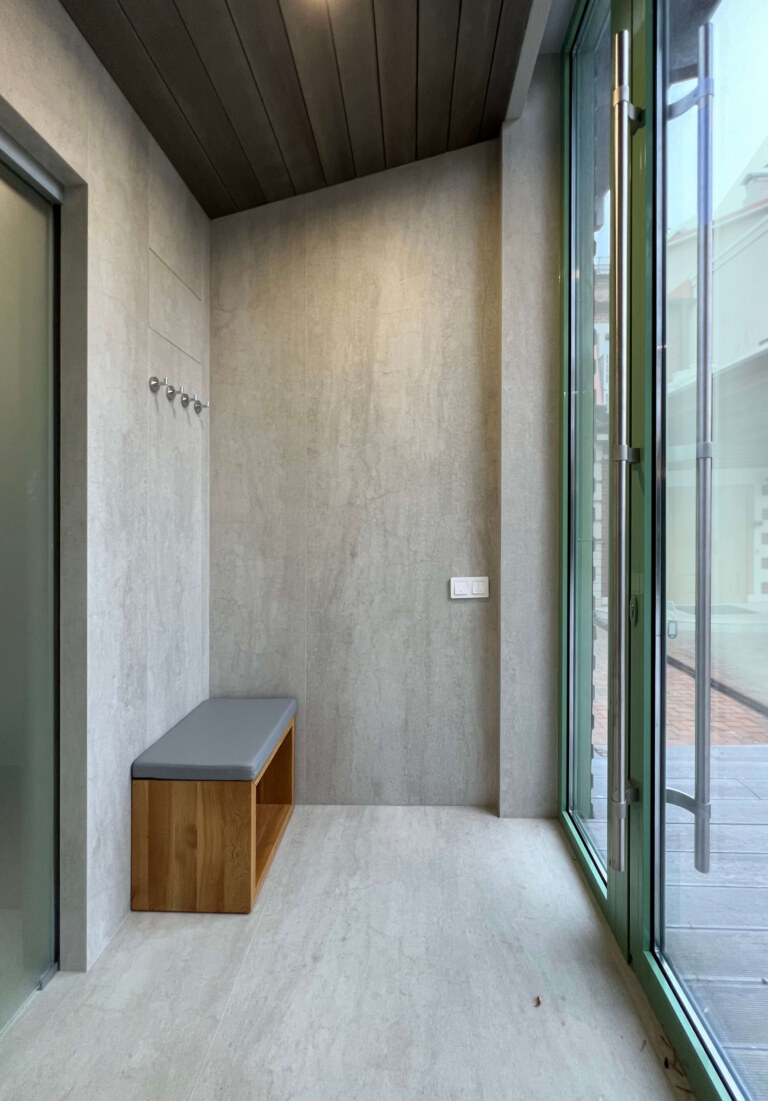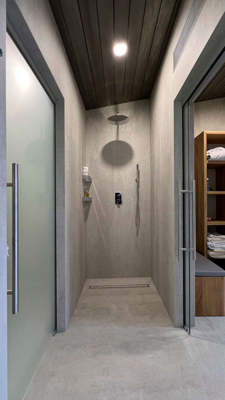 Интерьер максимально минималистичный, выполненный в светлых тонах и натуральных материалах, чтобы создать атмосферу максимального расслабления в условиях домашнего мини-спа.
