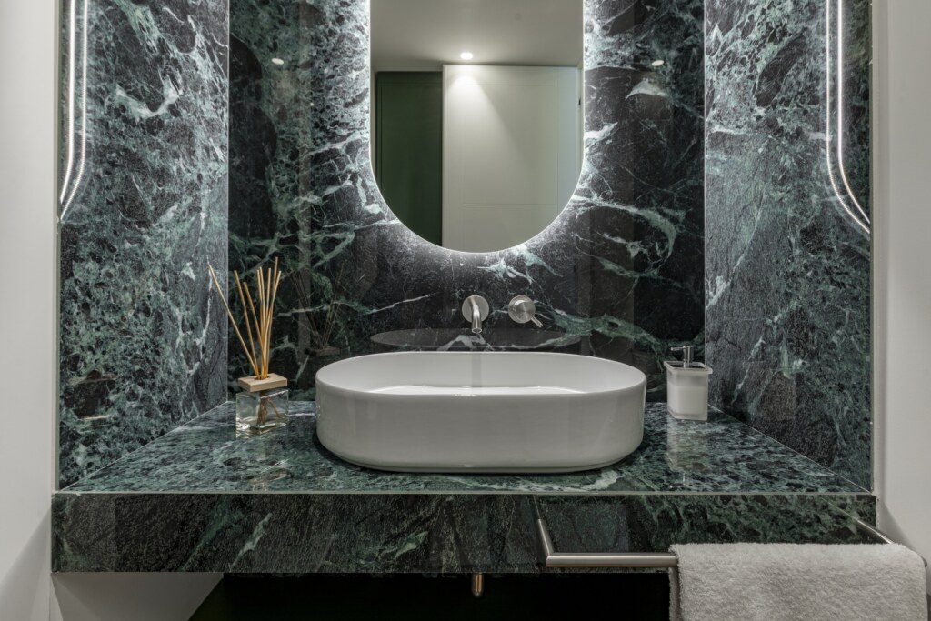Наконец, для облицовки вертикальных поверхностей одной из ванных комнат выбор остановился на выразительном тоне Verde Alpi Lucidato из строгой и элегантной коллекции I Naturali, способной придать ванной немного глубины, создавая вдохновленные природой современные и изысканные интерьеры.