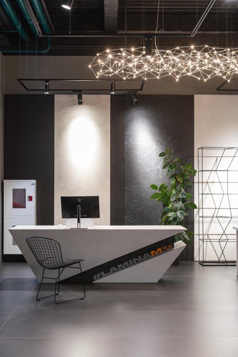 Шоурум был открыт в центре дизайна ARTPLAY SPb совместно с Керамика ARCH-SKIN Санкт-Петербург в ноябре 2019 года. Пространство шоурума полностью выполнено из керамики LAMINAM последних коллекций: полы, стены, мебель, раковины в кухонной зоне и в санузлах, экспозиторы. Интерьер спроектирован таким образом, чтобы максимально раскрыть потенциал керамических слэбов высотой 3 м и шириной 1 м. Автор проекта – Неля Румянцева создавала интерьер с отсылкой на концепцию open space — открытое и освещенное пространство с условными перегородками. Индивидуальные эскизы проекта «керамического интерьера» созданы студией Right design.