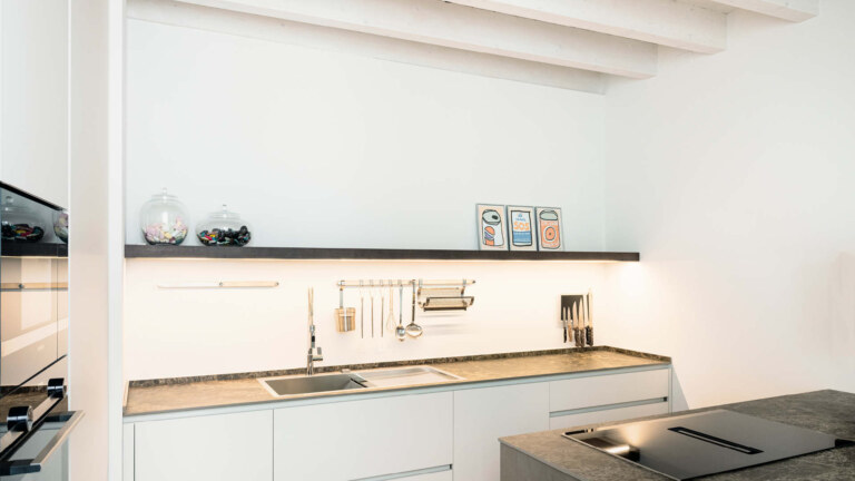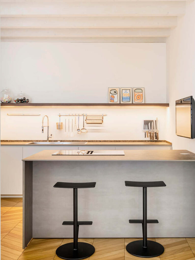 В соответствии с задумкой дизайнера Матео Герини здесь царит дух минимализма, который проявляется буквально во всем — от скрытых дверных ручек до белоснежных шкафов, словно «утопленных» в стену, и кухонной столешницы с эффектом мрамора.