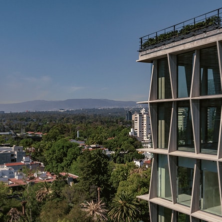 Первоклассный архитектурный комплекс, возведенный в согласии с принципами охраны окружающей среды: дизайнерское бюро Studio Donis, чьи успехи в области дизайна и архитектуры были неоднократно отмечены отраслевыми призами и наградами, построило в Мехико современное и высокотехнологичное здание, выбрав для впечатляющего фасада, напоминающего пчелиные соты, керамические поверхности I Naturali Laminam.