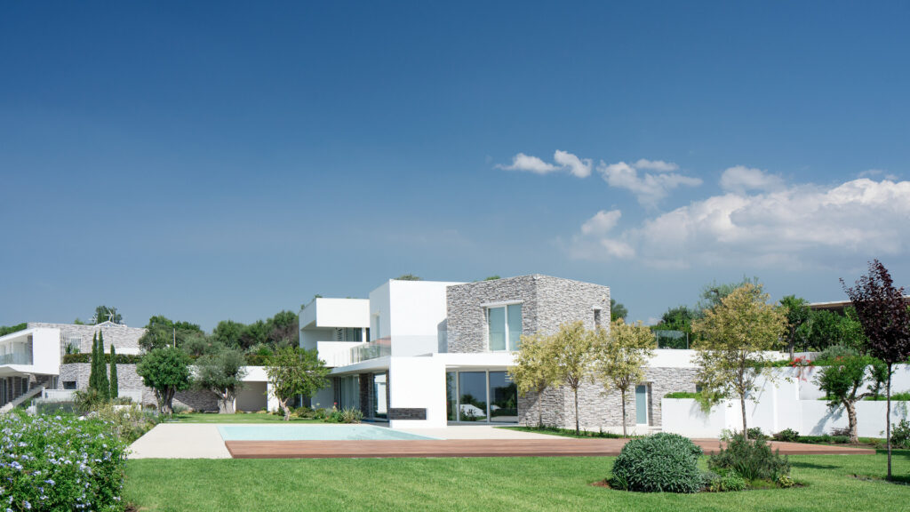 Эти отличительные черты прослеживаются и в новом особняке, который недавно был возведен в Катании. Четкие линии, широкие стеклянные двери и окна и просторные открытые пространства особенно выигрышно смотрятся при естественном освещении, которое в этом регионе отличается необычной яркостью. Даже оттенки материалов, выбранных для отделки дома, способствуют созданию теплой и уютной атмосферы. Единство покрытия полов внутри здания и дорожек снаружи выглядит особенно эффектно: для облицовки площадки вокруг бассейна под открытым небом и настила полов в доме были выбраны поверхности Laminam Calce Avorio.