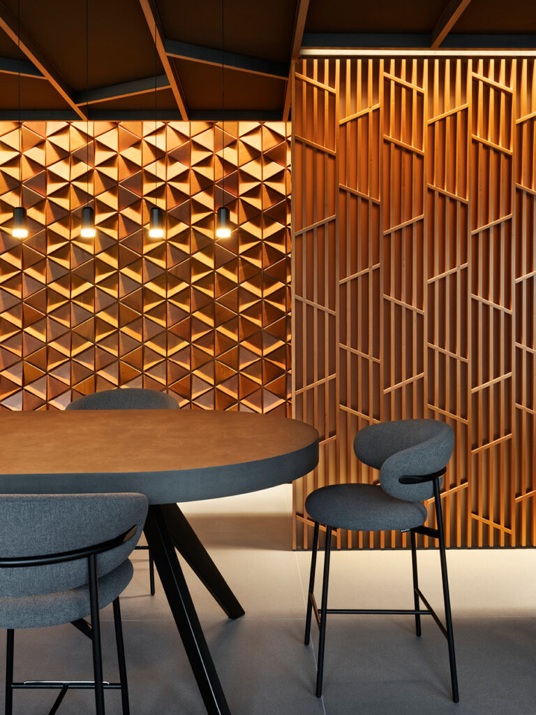 Для оформления стен в основных частях обеденного зала были выбраны декоративные элементы, отдаленно напоминающие японскую каллиграфию и создающие оптические иллюзии. Массивные перегородки делят пространство на отдельные зоны и образуют зигзагообразную линию, по которой гости двигаются внутри ресторана. Широкоформатные поверхности Pietra Piasentina, использованные для облицовки полов в зале, контрастируют со звукопоглощающим фальшпотолком, который словно состоит из отдельных сот, и образуют чрезвычайно гармоничный ансамбль.