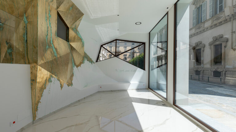 Если перевести взгляд с внешнего фасада на внутренние помещения, то большие окна на втором этаже выходят в современный вестибюль, также отделанный плитами Laminam, из которого можно попасть в художественную галерею, открытую для публики. Для облицовки стен в вестибюле новой элитной недвижимости в Турине и напольных покрытий в ванных комнатах было выбрано изысканное сочетание плит, вдохновленные белым мрамором из коллекции I Naturali.