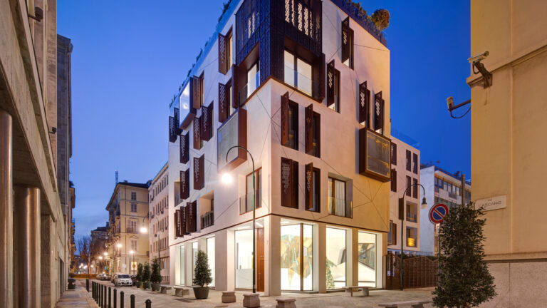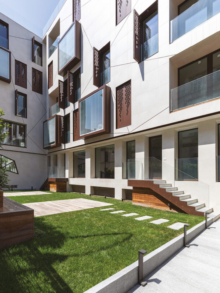 Авторы проекта крайне тщательно подошли к выбору материалов для модернизации этих невероятных фасадов. Они отдали предпочтение поверхностям Laminam размером 1000 × 1000 мм с толщиной Laminam 3+ из коллекции Calce Bianco, которая славится визуальными и тактильными характеристиками и создает эффект недавно оштукатуренной стены в полном соответствии с требованиями архитектурного рационализма.